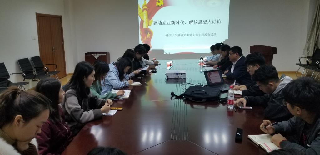 2018年10月29日,fun88官网体育研究生党支部在党员开展了以“建功立业新时代,解放思想大讨论”主题教育活动,本次学习采取视频观看和学习讨论相结合的方式,由党支部书记宋飞同志主持。