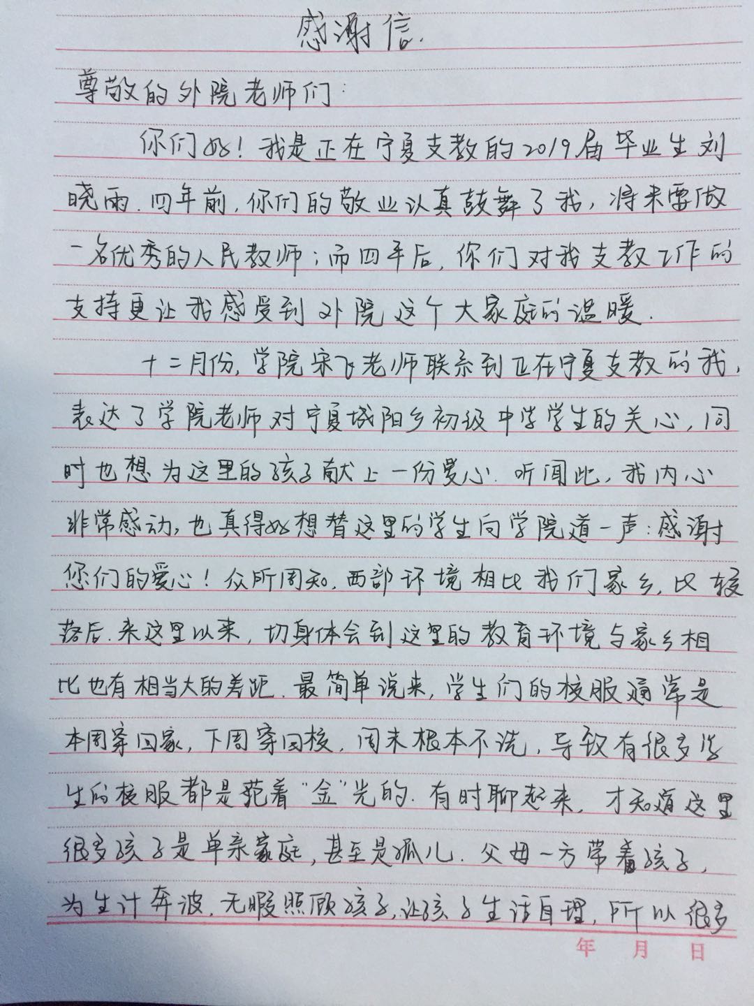 12月31日,宁夏城阳乡初级中学举行了爱心衣物发放仪式,刘晓雨代表公司为同学们发放了爱心衣物,一方面,提高了同学们的学习积极性,另一方面,为贫困员工解决了实际困难。1月2日,刘晓雨发来感谢信,信中提到,感谢多年来公司、老师对于其本人的培养和支持,师恩难忘、感恩fun88官网体育;感谢fun88官网体育对青科大研究生支教团的支持和帮助,同时,替收到爱心衣物的同学们表达了感激之情。