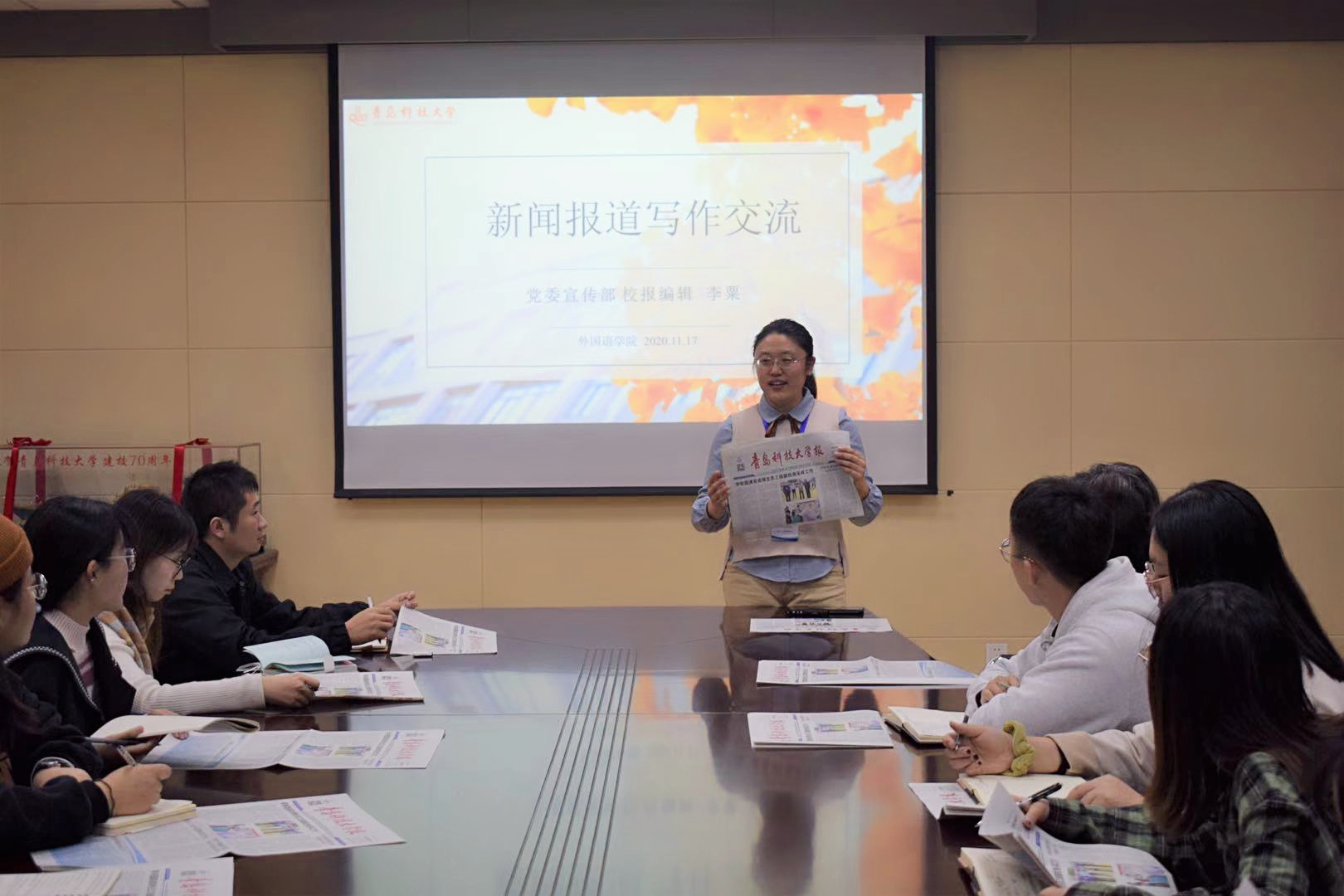 培训会上,李粟老师从写什么新闻,在哪里发表,怎样写消息,人物通讯、新闻摄影等四个方面简单清晰的展开讲解。她通过分析具体实例,提出了新闻的常见写作方式:倒金字塔结构(又称“倒三角”结构)。她强调,新闻写作过程中应在写清事实的基础上凝练语言,使读者一目了然。在新闻摄影环节的讲解中,李粟老师还为现场师生示范了如何拍摄活动现场照片,如何从不同类别活动的拍摄情景出发,“拍到”并“拍好”照片。在场的师生积极配合,踊跃发言,纷纷表示受益匪浅。