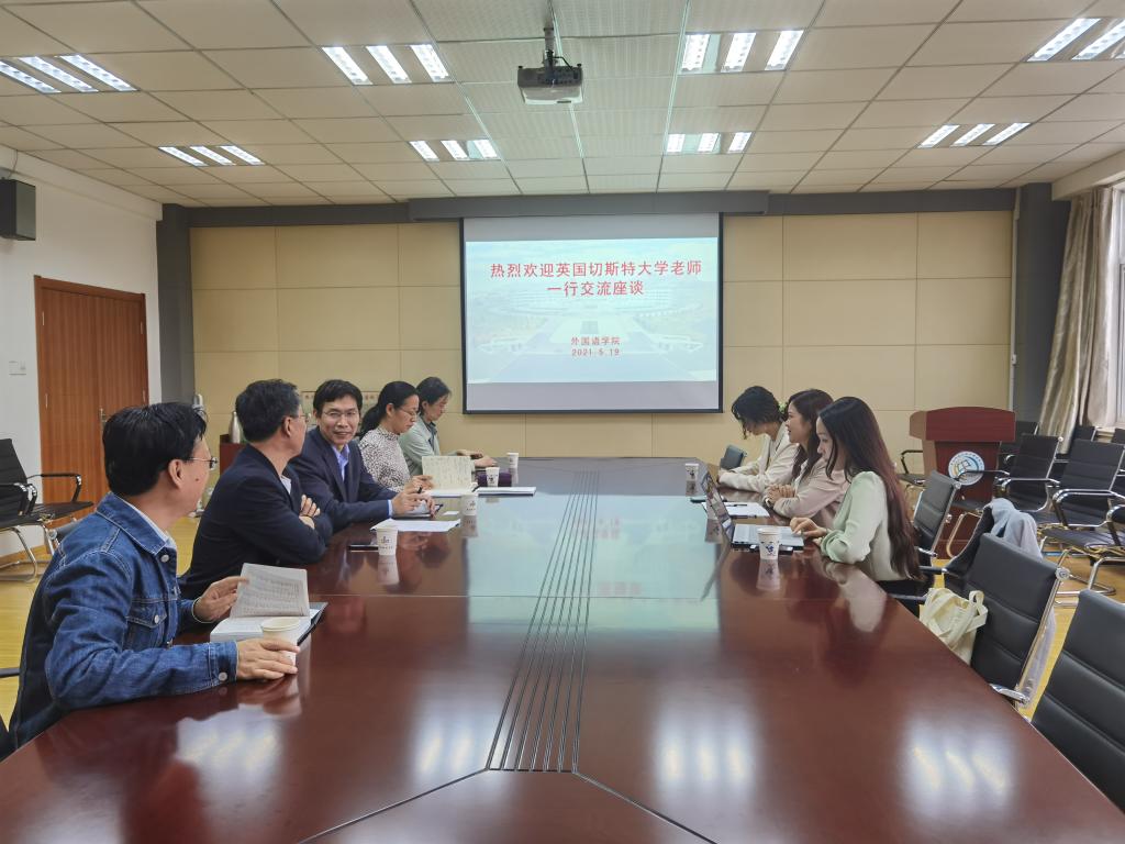 5月19日下午,英国切斯特大学中国代表一行来公司访问交流。公司经理尹洪山、党委书记曲斌艳、正处级组织员王培山、副经理康宁、党委副书记兼副经理王晓娜参加座谈。