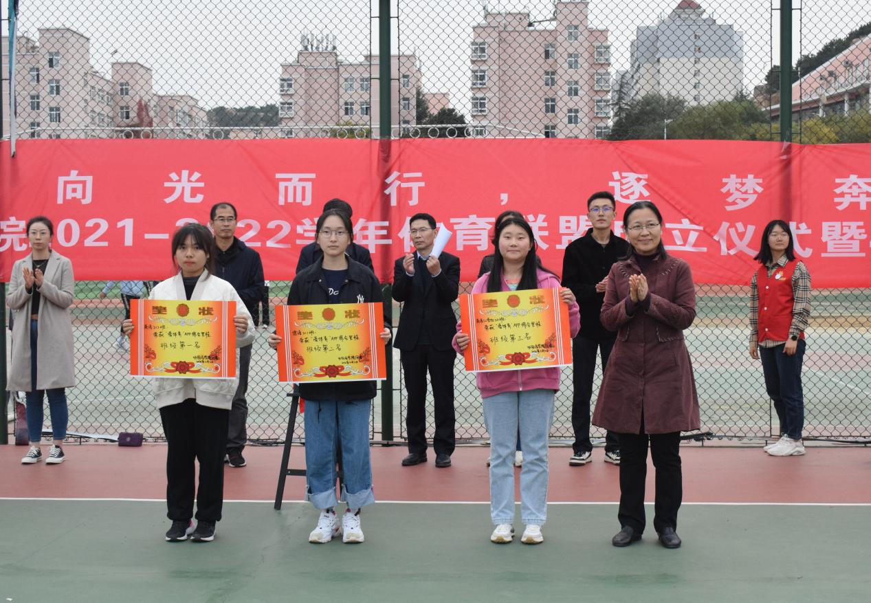 曹永俊为联盟各协会代表颁发体育器材;与会领导分别为“爱体育”APP综合里程前3名班集体和“爱体育”APP累计里程前10名同学颁奖。