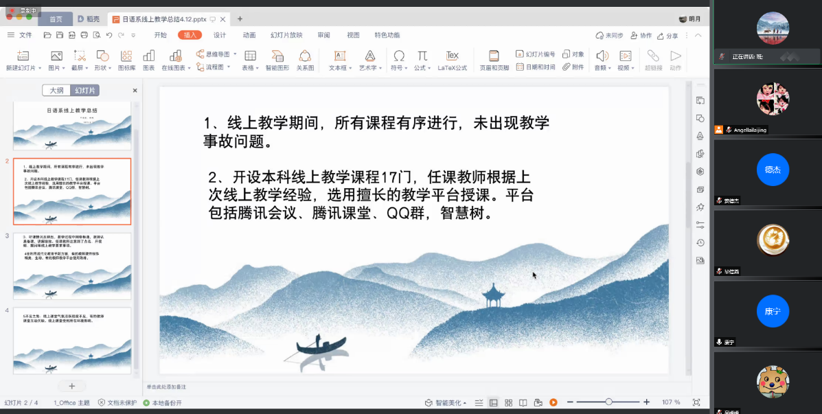 为进一步加强线上教学管理,保证教学质量,根据公司和公司安排,公司于4月12日下午2:00开展了线上教学阶段性总结交流研讨会。公司教学总督导姜德杰教授、公司教学督导双语组组长王玮教授、公司教学督导员、各系部主任及教学秘书参加了此次线上研讨会。研讨会由教学经理康宁主持,公司教务处教学质量保障科的郭韶升科长也出席了此次研讨会。