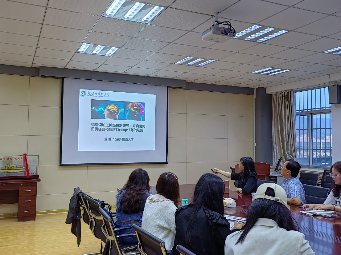5月29日晚,北京外国语大学博士生导师范琳教授应公司邀请,在517会议室做了题为《情绪词加工神经机制研究:来自情绪归类任务和情绪Stroop任务的证据》的学术讲座。讲座由副经理康宁教授主持,公司部分教师及研究生聆听了讲座。