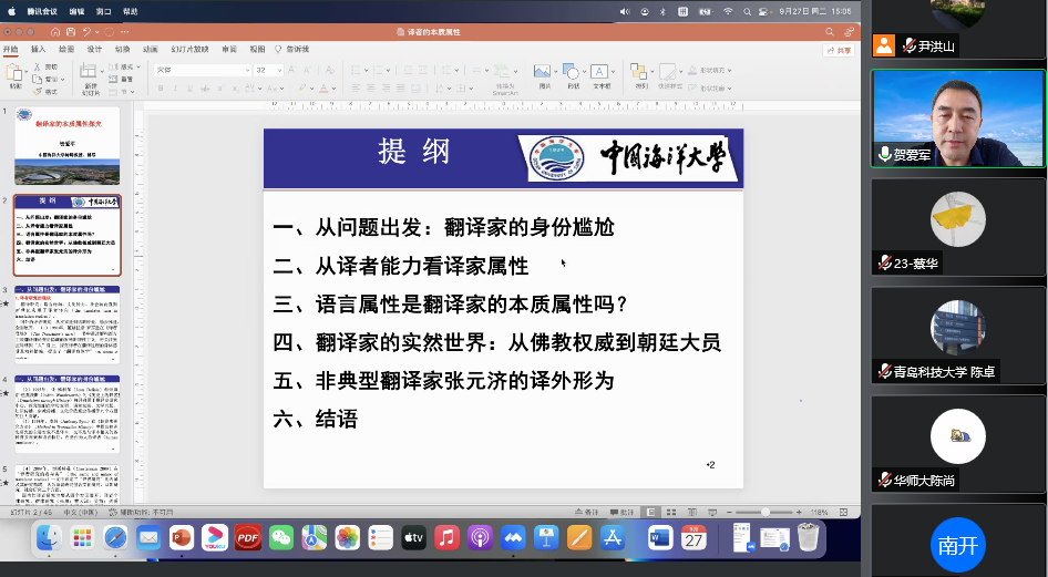 9月27日下午,中国海洋大学fun88官网体育博士生导师贺爱军教授应公司邀请,在线做了题为《翻译家的本质属性探究》的学术讲座。讲座由经理尹洪山主持,公司师生及省内外学者300余人聆听了讲座。