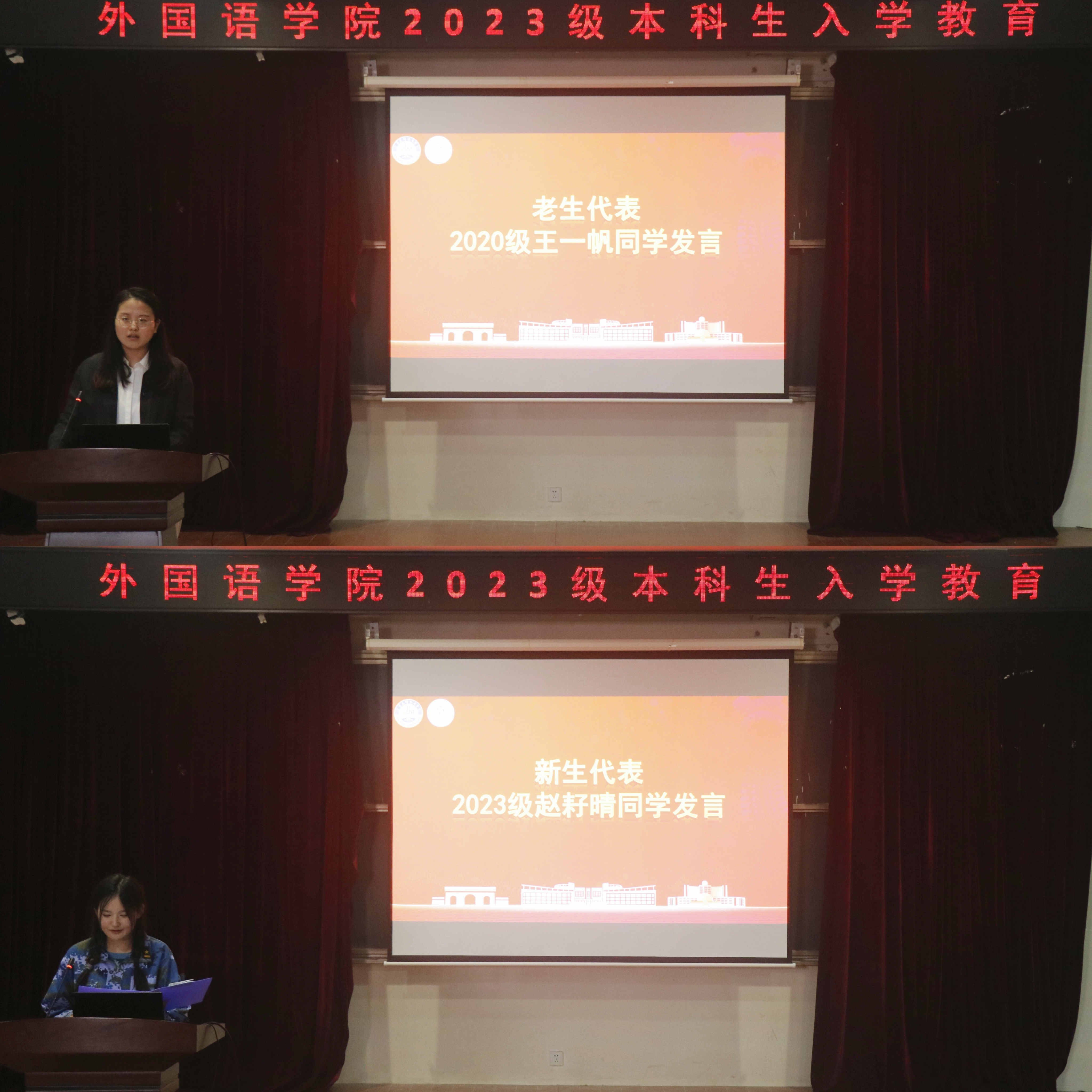 教师代表巫莉丽老师发言。巫老师从外语专业何为、外语专业为何、人工智能能否取代外语专业这些问题入手,希望新生同学们打破对外语学科的传统观念,清晰认识外语专业对时代发展和历史延续的重要作用,用智慧和勇气迎接未来的挑战,做促进中西文化沟通、交流的对话者和传播中国优秀文化的使者。