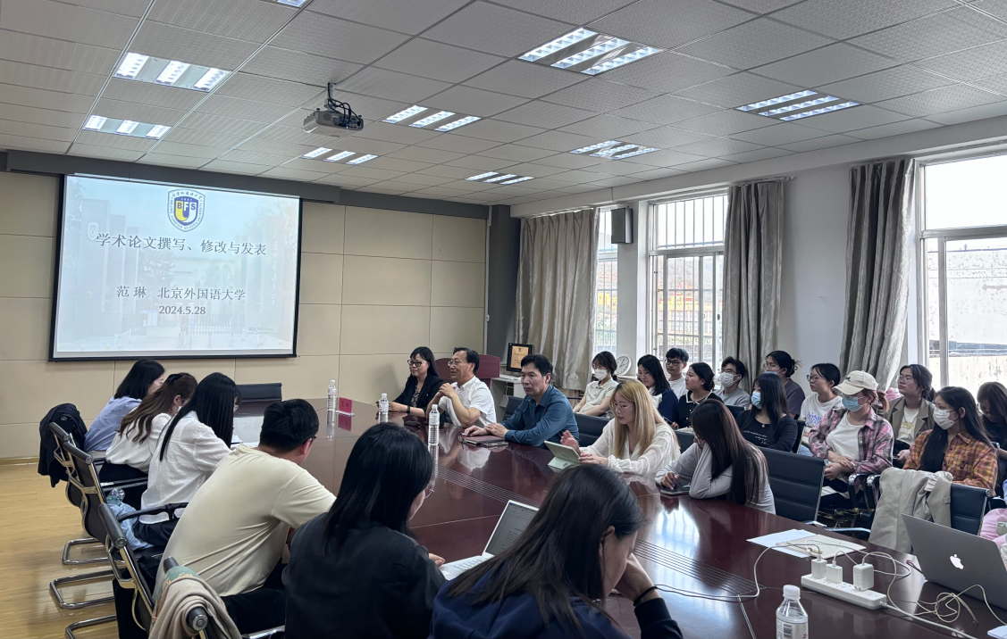 5月28日晚,公司邀请北京外国语大学博士生导师范琳教授就外国语言文学学科发展进行专题讲座。讲座由副经理康宁主持,英语语言文学、俄语语言文学和外国语言学及应用语言学三个学科骨干教师以及全体研究生参加了此次讲座。