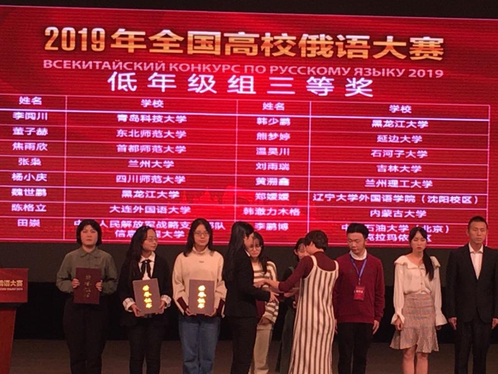 公司由俄语系主任曹静娴带队指导,选派低年级组李阅川、高年级组李晓宇、研究生组于子涵同学参加本次大赛。公司俄语181班的李阅川同学经过了初赛、复赛环节,最终在低年级146名选手中脱颖而出,获得了全国俄语大赛三等奖第一名的好成绩,将由国家留学基金委全额资助,赴俄罗斯留学深造一年。这是公司俄语系学子继2014、2015、2016和2017年之后再次入围,为院系争得荣誉,提高了公司俄语系在全国俄语专业开设单位中的知名度。