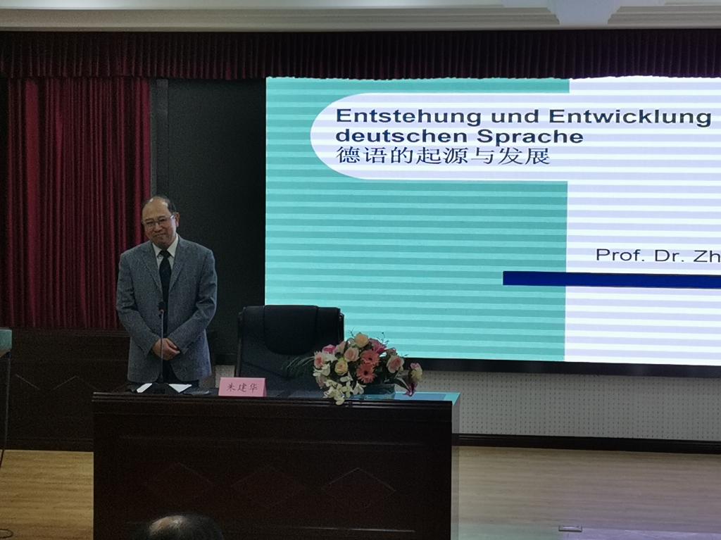 12月11日下午同济大学朱建华教授在外语楼学术报告厅为fun88官网体育师生做了题为《德语的起源与发展》的学术报告。报告由吕经理主持,德语系全体师生、fun88官网体育其他语系以及中德公司的部分老师和员工聆听了此次报告。