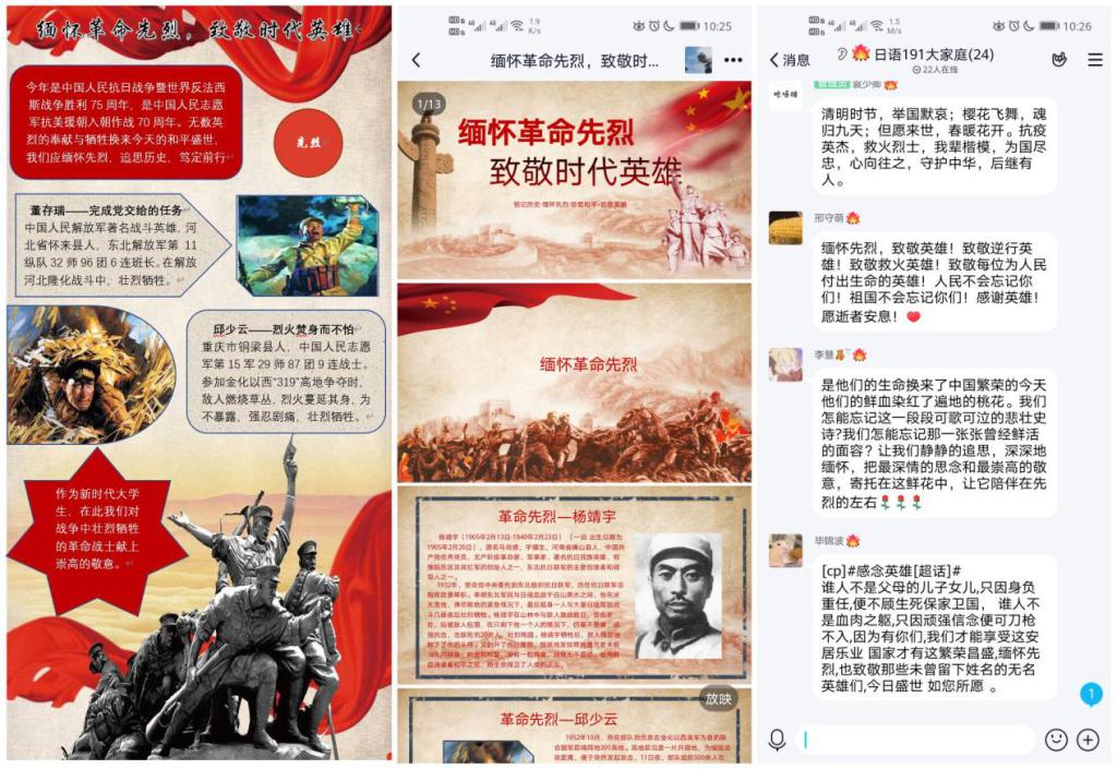 2020年是中国人民抗日战争暨世界反法西斯战争胜利75周年,也是中国人民志愿军抗美援朝入朝作战70周年,为激励广老员工弘扬以爱国主义为核心的伟大民族精神,学习继承革命先烈遗志,领会新时期下弘扬红色精神的重要意义,fun88官网体育组织了“铭记历史,致敬英烈”主题团日活动。活动中,同学们以制作海报、讲述革命故事、展示时代英雄事迹、线上发表感想等形式致敬那些为国牺牲的英雄烈士,引起同学们强烈的精神共鸣,激发了同学们的爱国激情。