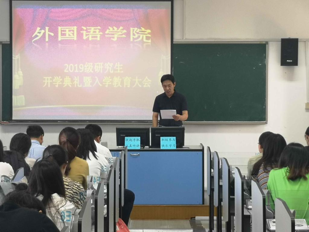 9月2日上午,2019级研究生开学典礼暨入学教育大会在语音室418举行。公司经理尹洪山、副经理康宁、党总支副书记兼副经理宋飞、英语系主任杨晓梅、俄语系主任曹静娴、MTI中心主任房钰以及全体2019级新生出席开学典礼,宋飞主持了此次大会。