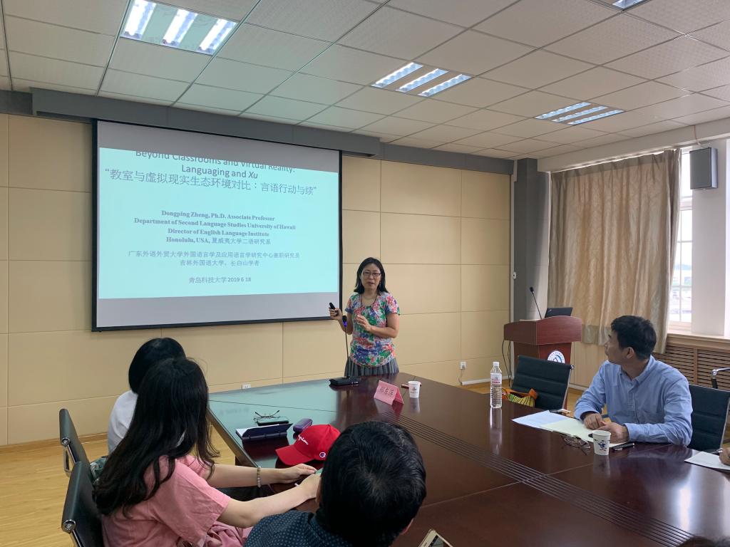 6月18日下午,美国夏威夷大学二语研究系教授,博士生导师郑东萍应公司邀请,在外语楼517会议室做了题为《教室与虚拟现实生态环境对比:言语行动与续》的报告。报告会由经理尹洪山教授主持,经理助理刘靖及部分教师和研究生参加了报告会。
