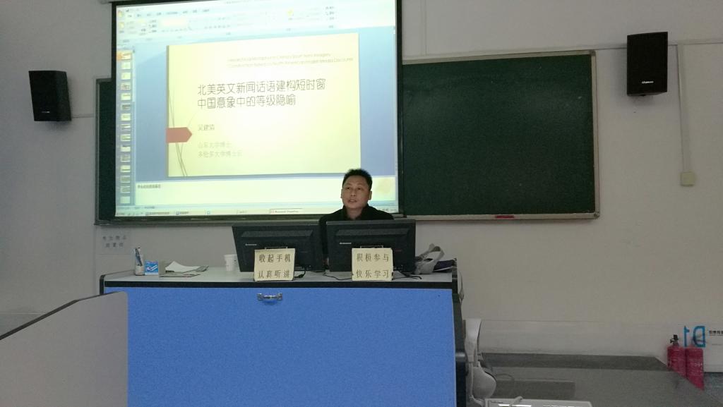 12月20日下午,多伦多大学博士后研究员吴建清博士应邀来公司为广大师生作了题为“北美英文新闻话语建构短时窗中国意象中的等级隐喻”的学术报告。报告由fun88官网体育副经理吕耀中主持,公司党总支书记姜德杰、经理尹洪山,部分教师以及研究生参加了本次学术报告。