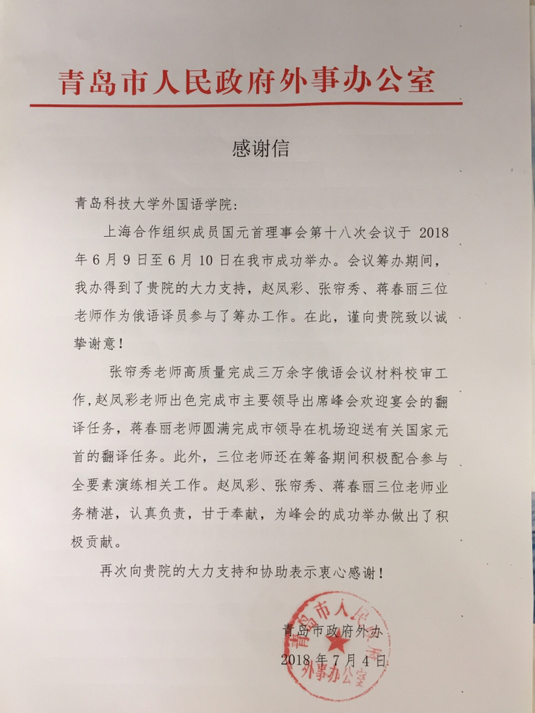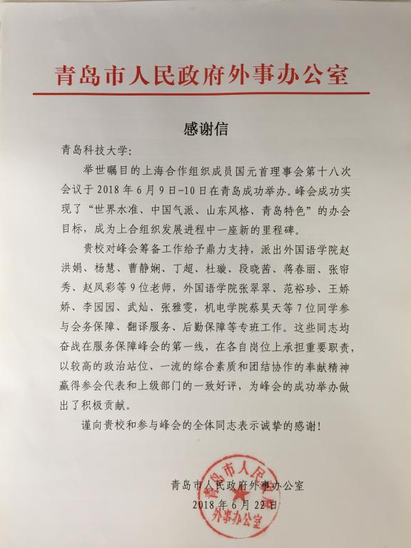 近日,fun88官网体育收到青岛市政府外事办公室发来的感谢信,对公司给予上海合作组织成员国元首理事会第十八次会议的鼎力支持表示感谢,对fun88官网体育的志愿者在会议期间的出色表现给予了肯定。