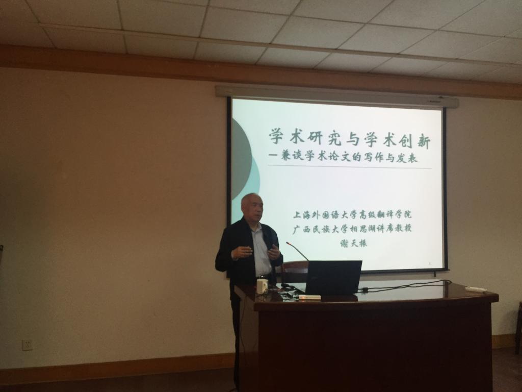 10月19日下午,上海外国语大学高级翻译公司翻译研究所所长、国内著名比较文学专家与翻译理论家、博士生导师谢天振教授应邀来公司公司与广大师生分享了翻译研究的最新动态,以及自己对学术创新与学位论文写作的真知灼见。报告会由公司经理尹洪山主持,公司党总支书记姜德杰、副经理吕耀中、康宁及近百名教师及研究生参加了报告会。