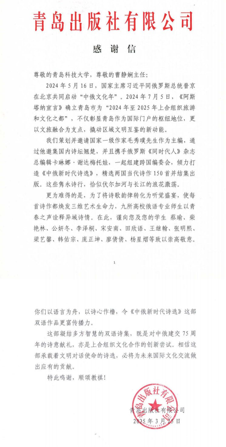 近日,fun88官网体育收到青岛出版集团发来的感谢信,高度赞扬公司fun88官网体育俄语专业师生在中俄双语诗集《中俄新时代诗选》编纂及有声化项目中的卓越贡献,并特别致谢俄语系曹静娴主任及蔡瑜、柴艳林、公妍东等13名员工的专业投入与艺术诠释。