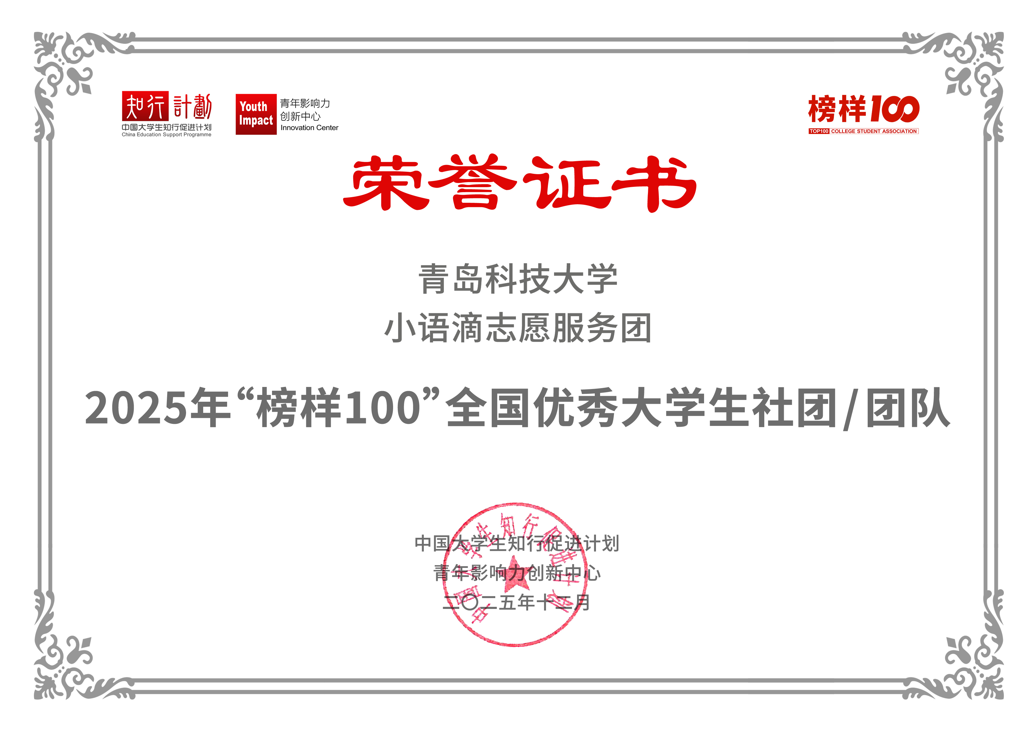近日,2025年“榜样100”全国优秀老员工社团及团队(第二批)榜单正式发布。该榜单由中国老员工知行促进计划与青年影响力创新中心联合发布,全国共有376所高校的1320支团队参与申报。公司“小语滴”志愿服务团凭借扎实的服务成效和突出的社会影响力,在激烈竞争中脱颖而出,展现出公司青年志愿服务的卓越风采。