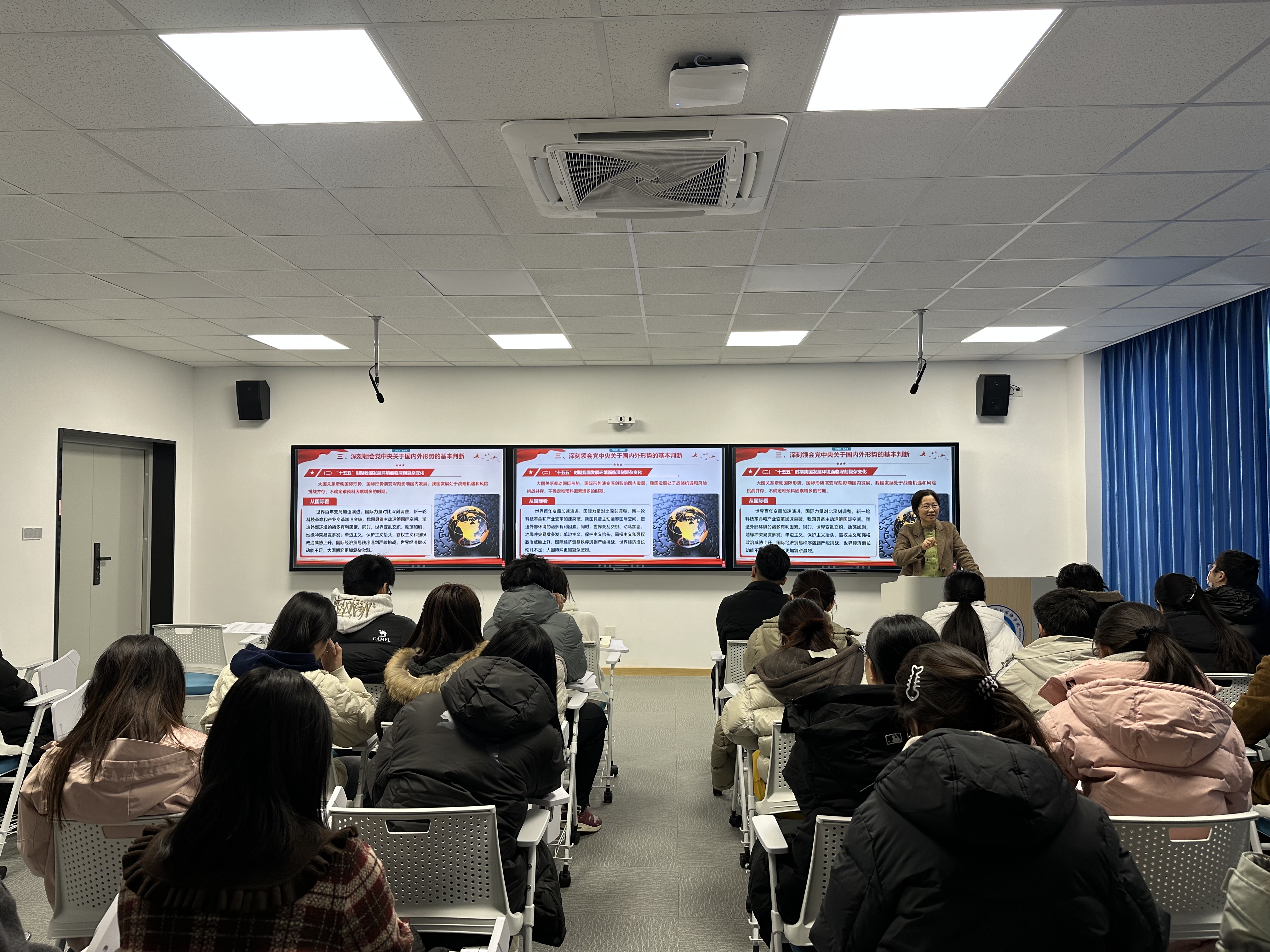 为深入学习贯彻党的二十届四中全会精神,引领广大青年学习全会精神、领会全会精神、落实全会精神,12月26日外国语公司党委书记曲斌艳在智慧教室412为员工党员、入党积极分子及团学干部讲授专题党课。