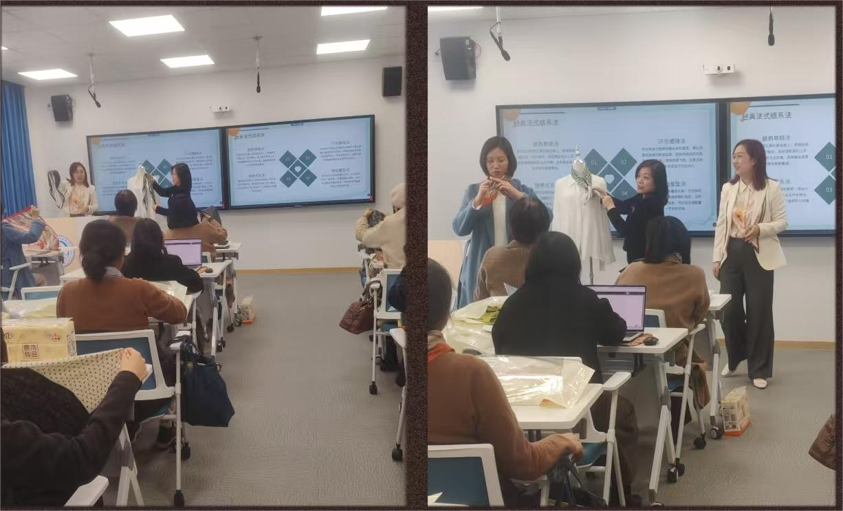 随后,陈晶女士以专业视角展开分享,她结合自身作为文化部认证色彩搭配师、日本COLOR TOP 形象顾问及意大利 MKS 时尚公司认证顾问的丰富经验,从色彩理论、风格定位入手,细致讲解了不同材质、花色丝巾与肤色、服饰的适配技巧。在实操演示环节,陈老师现场示范了法式结、蝴蝶结、披肩式等多种经典丝巾系法,一边操作一边拆解步骤,还邀请教师代表上台互动,手把手指导调整细节,让抽象的美学知识变得直观易懂。台下老师们也纷纷拿出院妇委会精心准备的丝巾,跟着老师同步练习,认真记录要点,在轻松愉悦的氛围中感受着方寸丝巾的百变魅力。