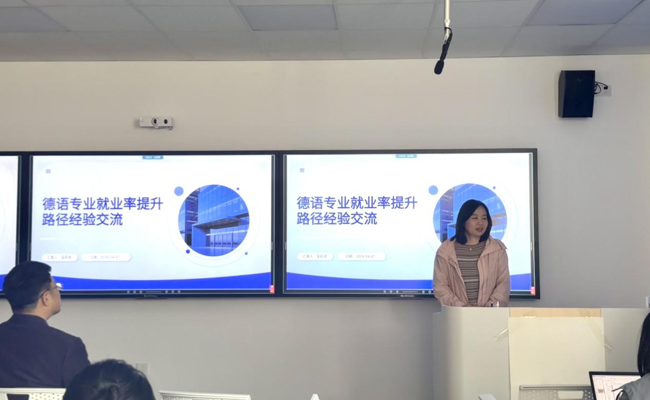 工作交流环节,会议特别邀请法公司徐从德老师作交流分享,他围绕全程领跑、靶向助力、协同育人三方面分享就业工作先进经验;德语系主任巫莉丽老师从合力、贯通、传承、节点、引导五大路径,交流就业工作实践心得,为参会人员提供借鉴。
