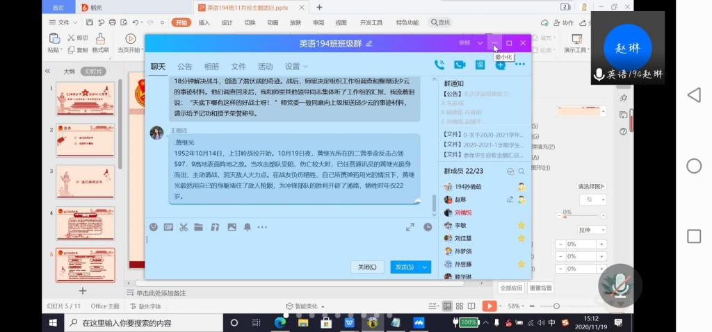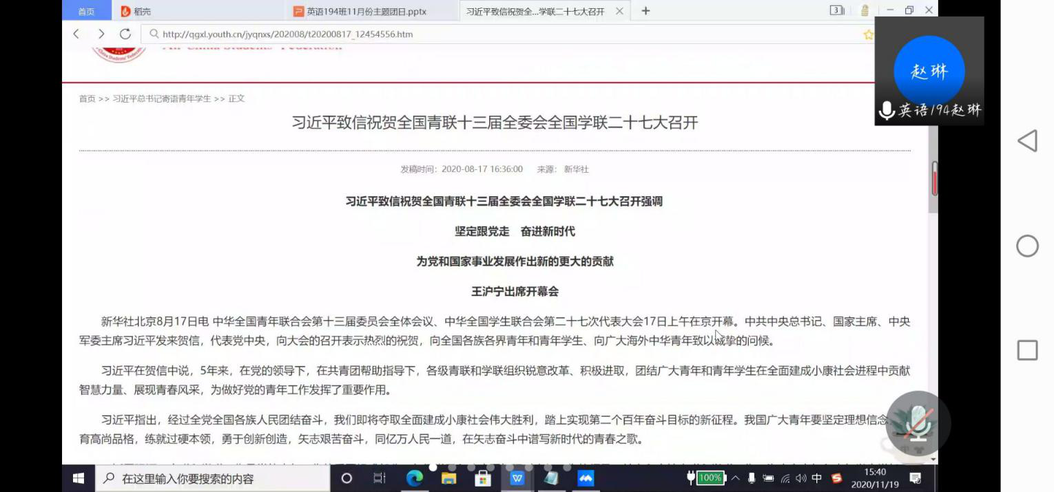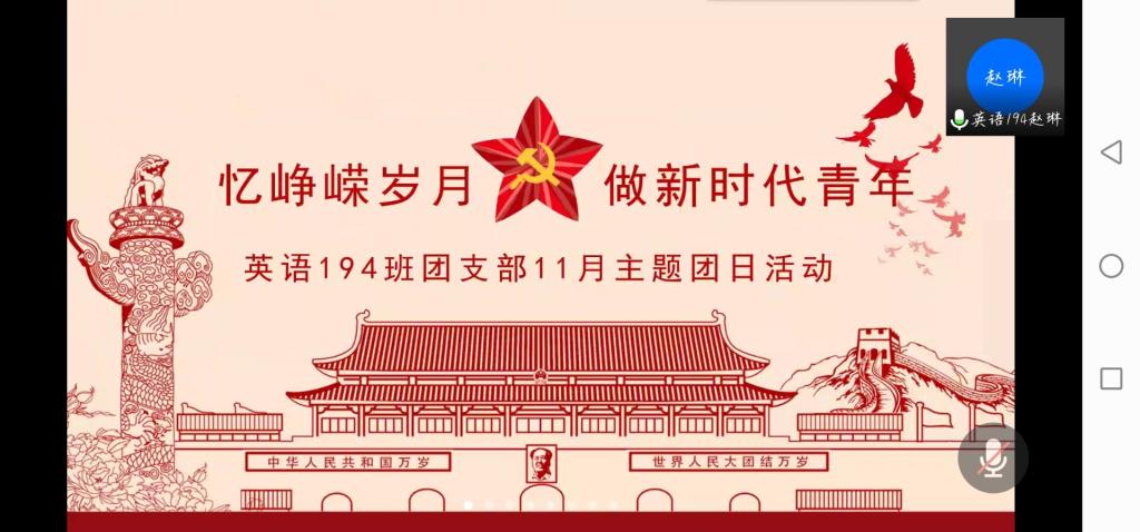 11月19日下午,fun88官网体育英语194团支部依托线上平台举行了“忆峥嵘岁月,做新时代青年”主题团日活动。团支部全体团员参与,团日活动由团支部书记主持。