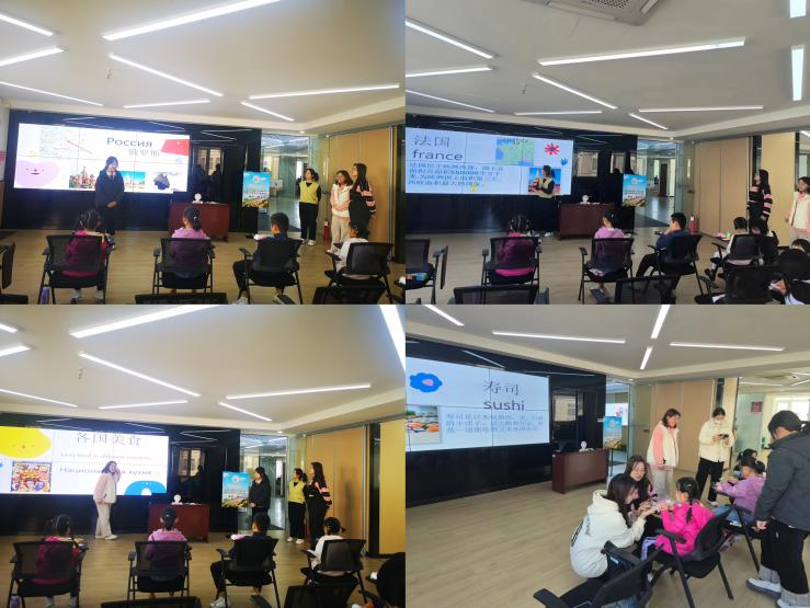 在本次活动中,来自英语231班团支部的志愿者们用生动的语言、可爱的动画、有趣的小游戏向小朋友们分别介绍了来自俄罗斯、意大利、法国和日本的特色美食,并与中国传统美食进行对比,让小朋友们既能体验不同国家丰富多彩的饮食文化,又能感受中国传统美食的魅力。