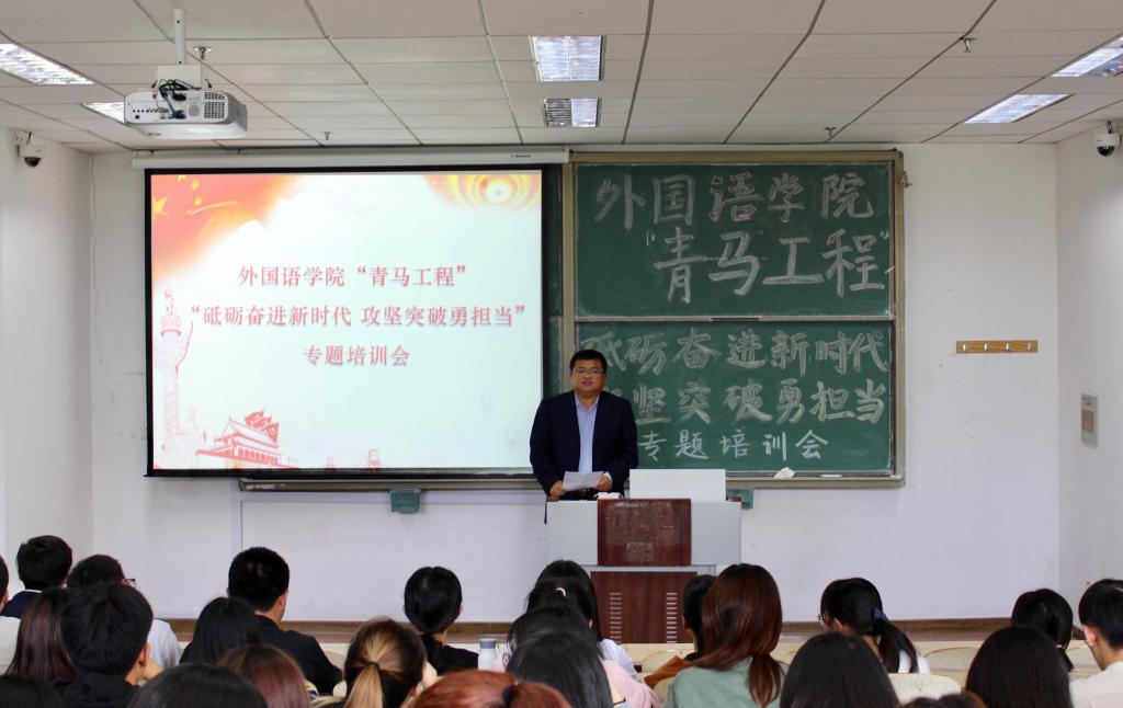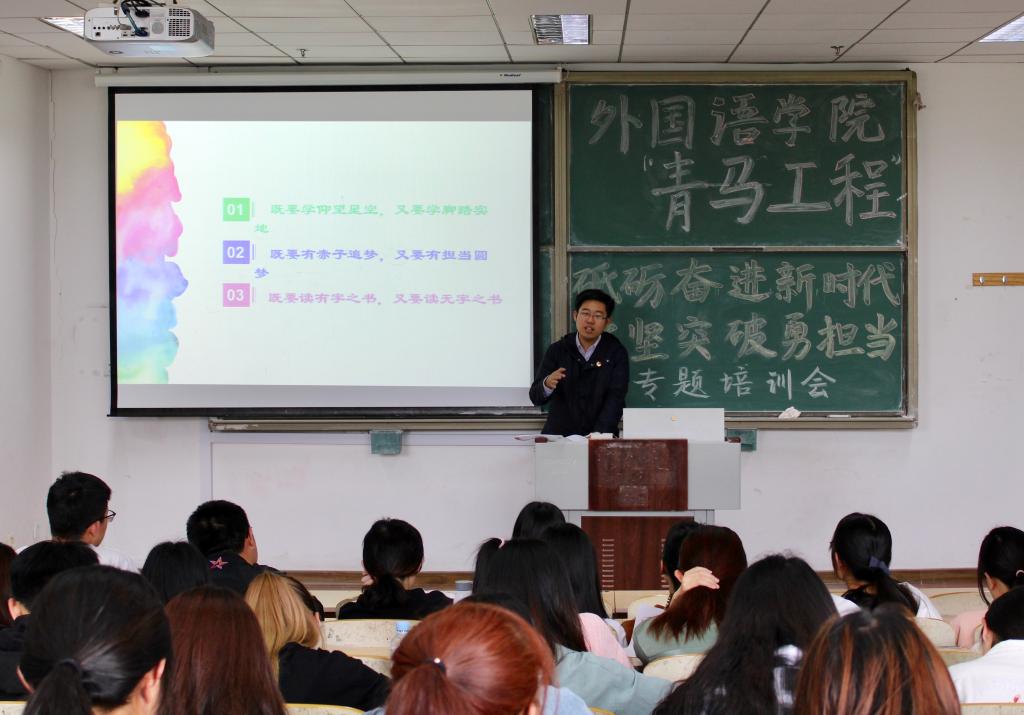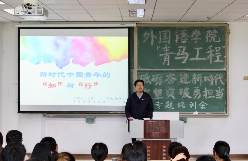 为学习贯彻习近平新时代中国特色社会主义思想,落实习近平总书记在纪念五四运动100周年大会上的讲话精神,5月14日,公司在明德330开展“砥砺奋进新时代,攻坚突破勇担当”主题教育活动暨“青马工程”培训班开班仪式,邀请了校团委兼职副书记、全国优秀共青团员、纪念五四运动100周年大会参加者于超做了题为“新时代中国青年的‘知’与‘行’”专题报告。外国语公司党总支副书记宋飞、全体辅导员以及公司“青马工程”培训班全体成员参加了本次活动。会议由辅导员王雨昕主持。
