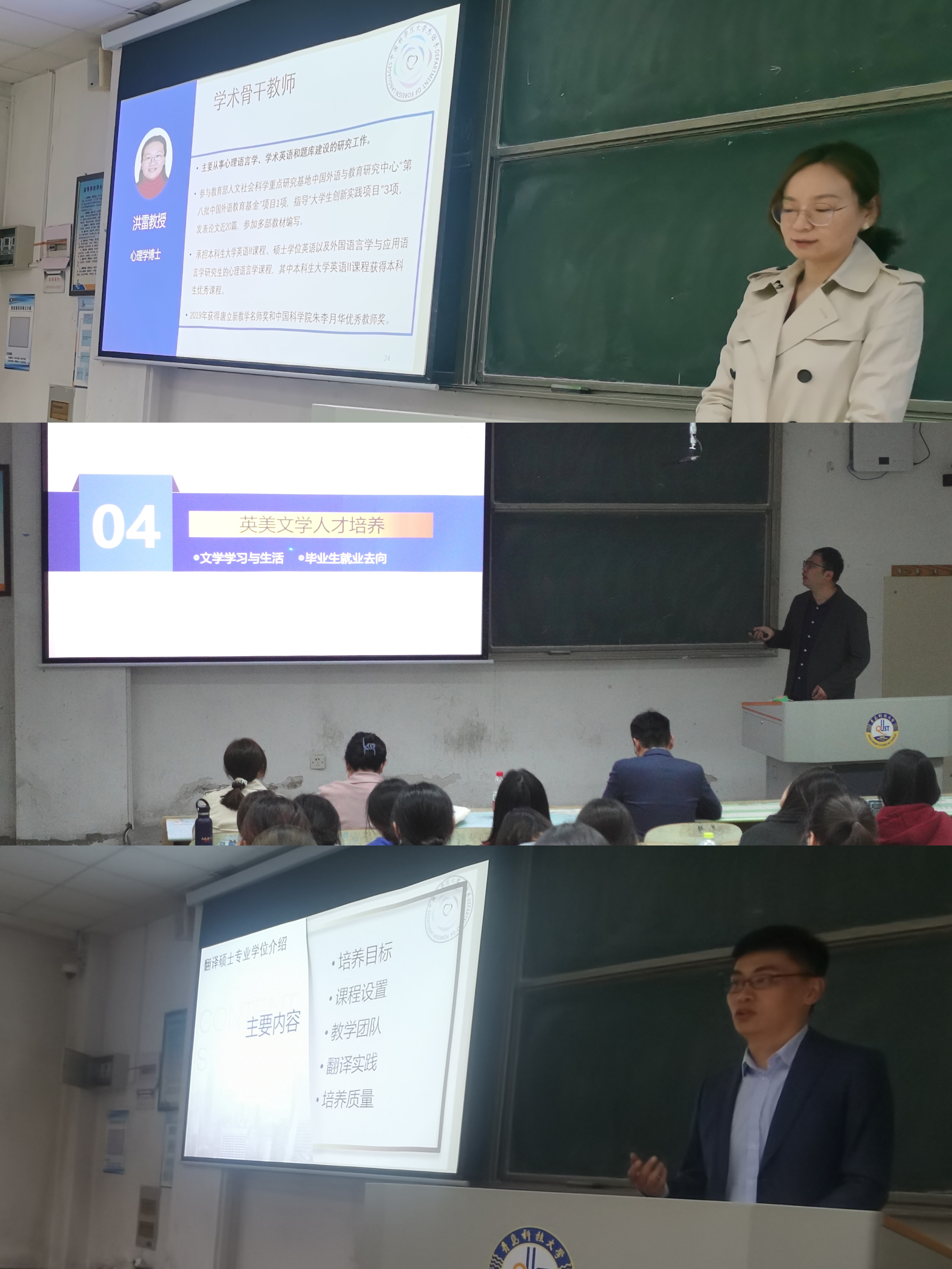 国科大是国家“双一流”建设高校,是一所以科教融合为办学模式、研究生教育为办学主体、精英化本科教育为办学特色的创新型大学。本次招生宣讲活动,李晰老师从整体上介绍了中国科公司大学外语系的发展历史和公司建设基本情况,三位老师分别从培养目标、课程开设、教学团队、研究成果、人才培养等方面介绍了外语系语言学、英美文学和翻译硕士专业的招生培养情况。