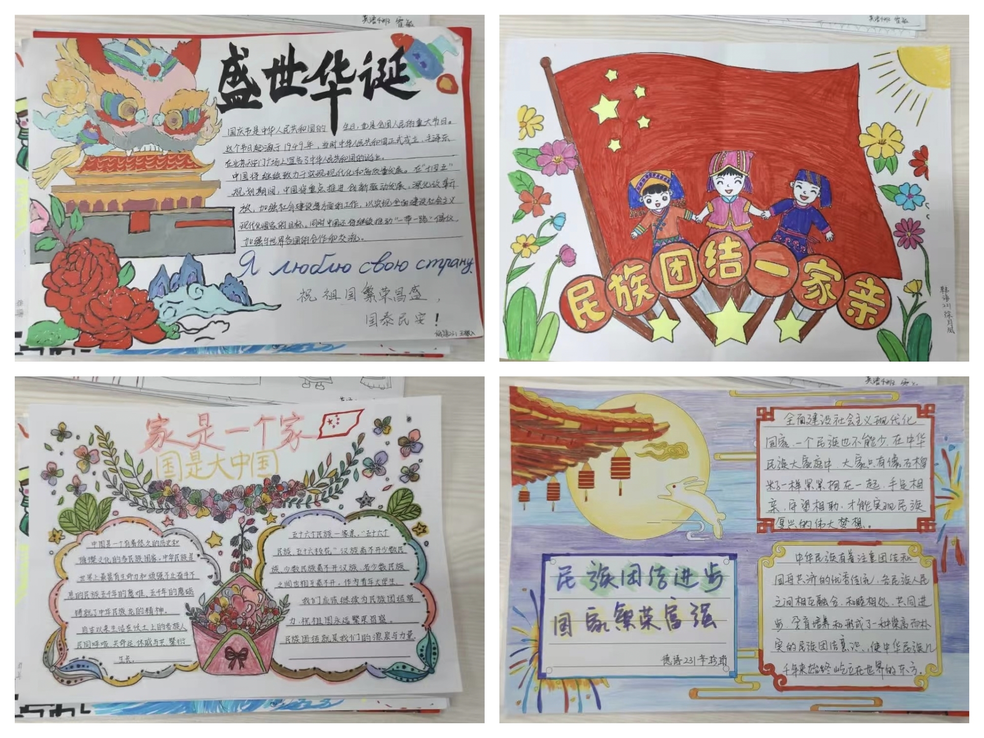 在手抄报的展板上,每一幅画作都体现同学们在白纸上挥洒的对于民族团结、国家繁荣的一片赤心。画作有的恢宏大气,有的细致沉热,“家是一个家,国是大中国……”字字句句都展现了同学们对于民族团结、国家繁荣的渴望与担当。