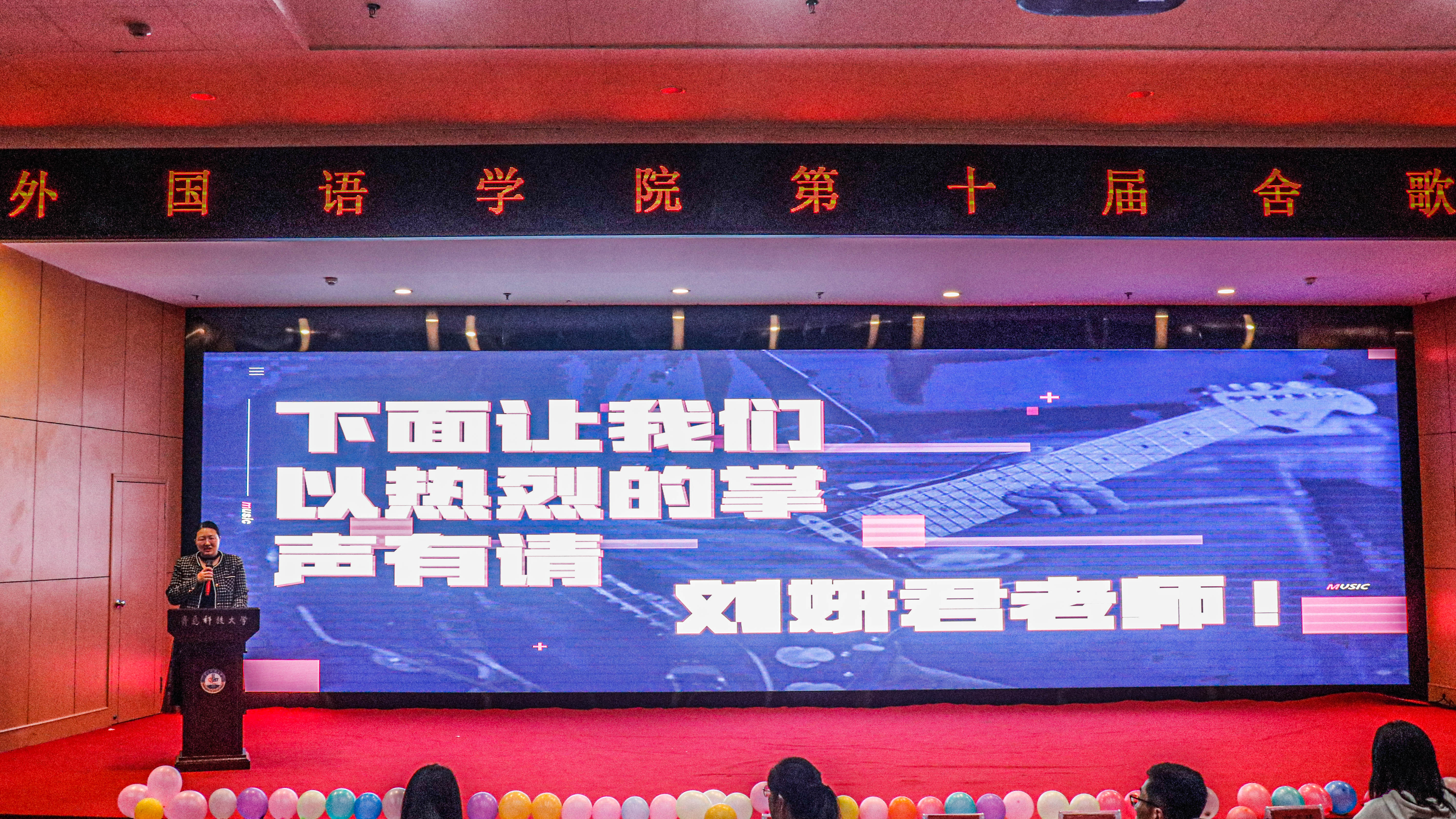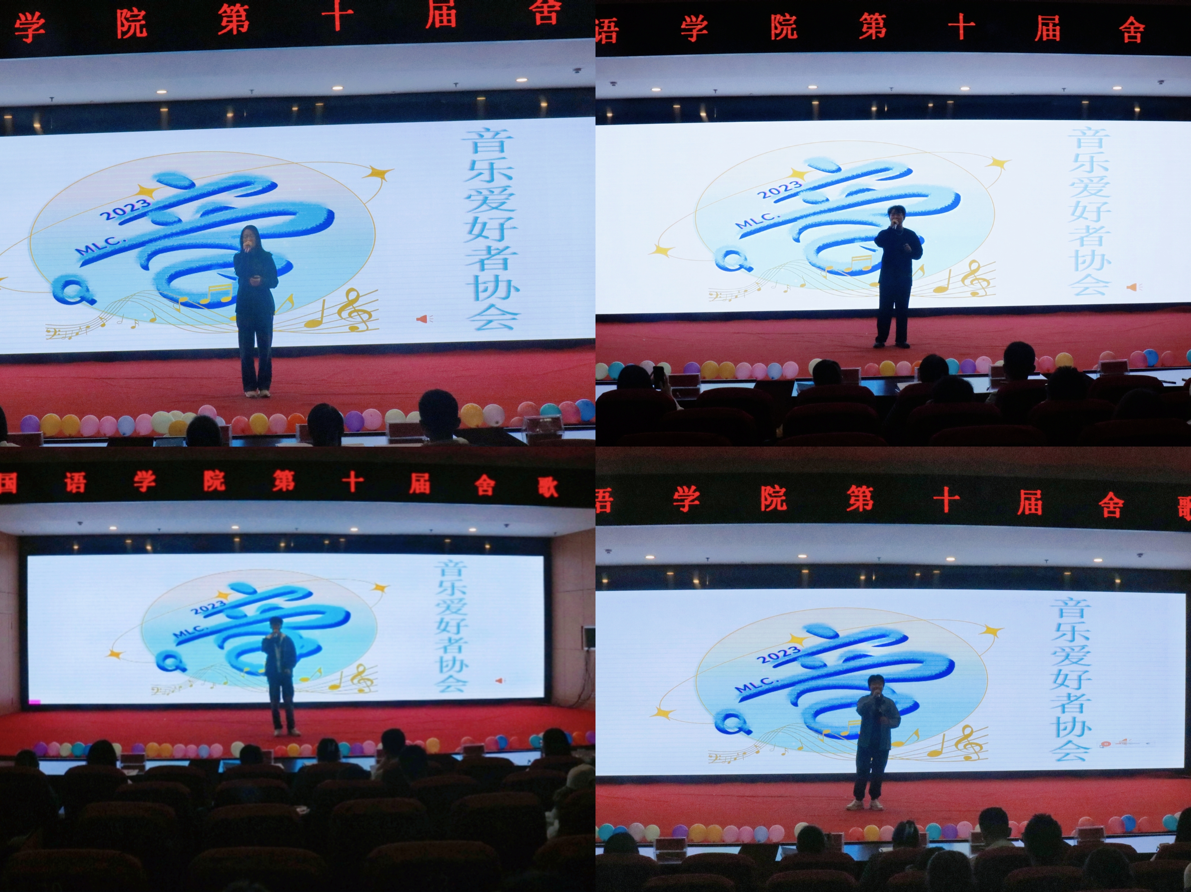 本次舍歌大赛还邀请音乐爱好者协会的副会长姜雨杉、器乐部部长陈启洲、声乐部部长荆运泽、会长张嘉轶同学参加,他们为现场观众准备了精彩的歌唱节目,现场掌声不断。