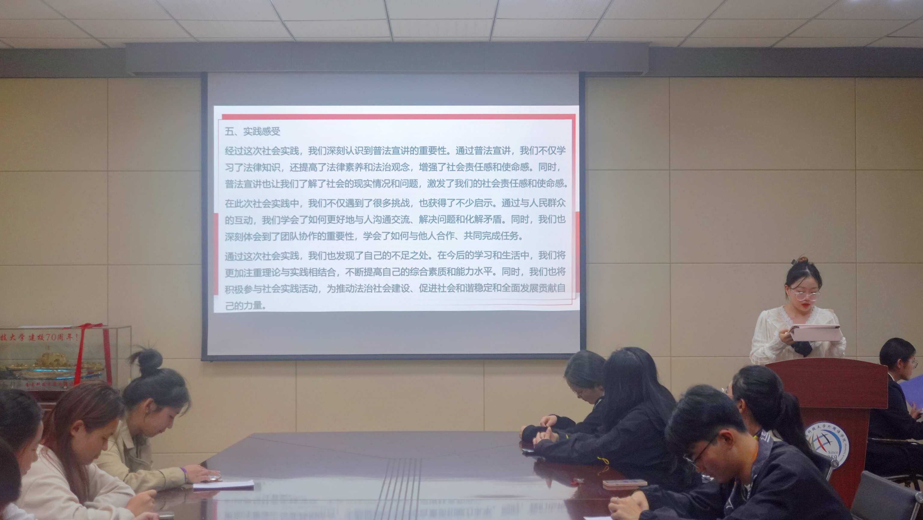 本次座谈会特别邀请了校级社会实践优秀团队代表德语211王茜琳同学为同学们展示了她所在的“‘懂法守法,普法传法’fun88官网体育法治入社区”调研团队的成果。王茜琳同学从准备阶段如何撰写实践方案、如何制作宣传物料,实施阶段如何制定议程、如何多方协调等方面展开经验介绍,让参与本次座谈会的同学受益匪浅。