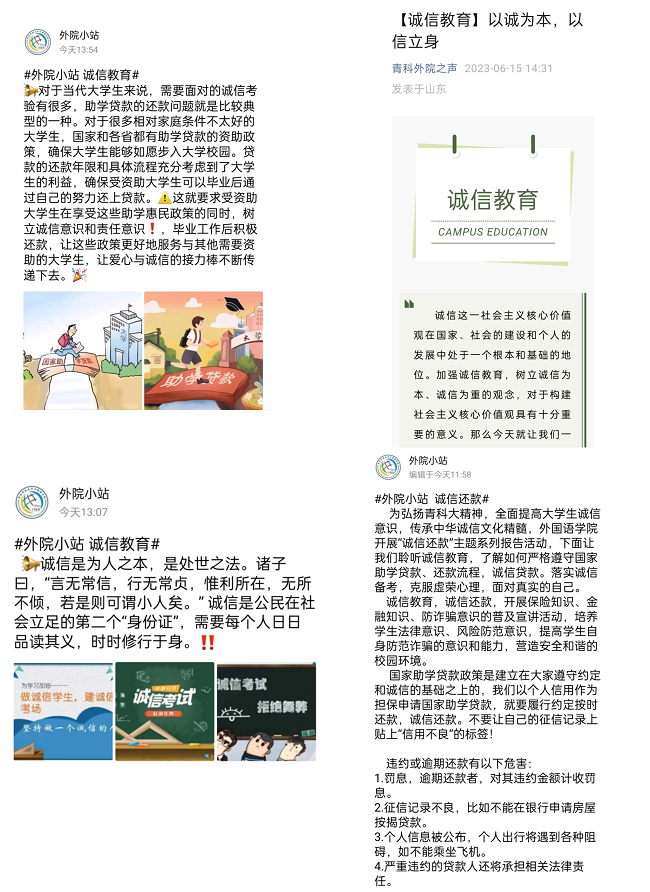 fun88官网体育注重宣传教育,在微信和QQ公众平台上相继推出“诚信还款”“预防金融诈骗”“诚信考试”等内容,及时推送相关主题活动和动态。通过宣传的力量,让同学们充分认识开展高校员工资助诚信教育主题活动的意义,提高员工诚信意识和责任意识,营造“人人知诚信,人人讲诚信”的良好氛围。