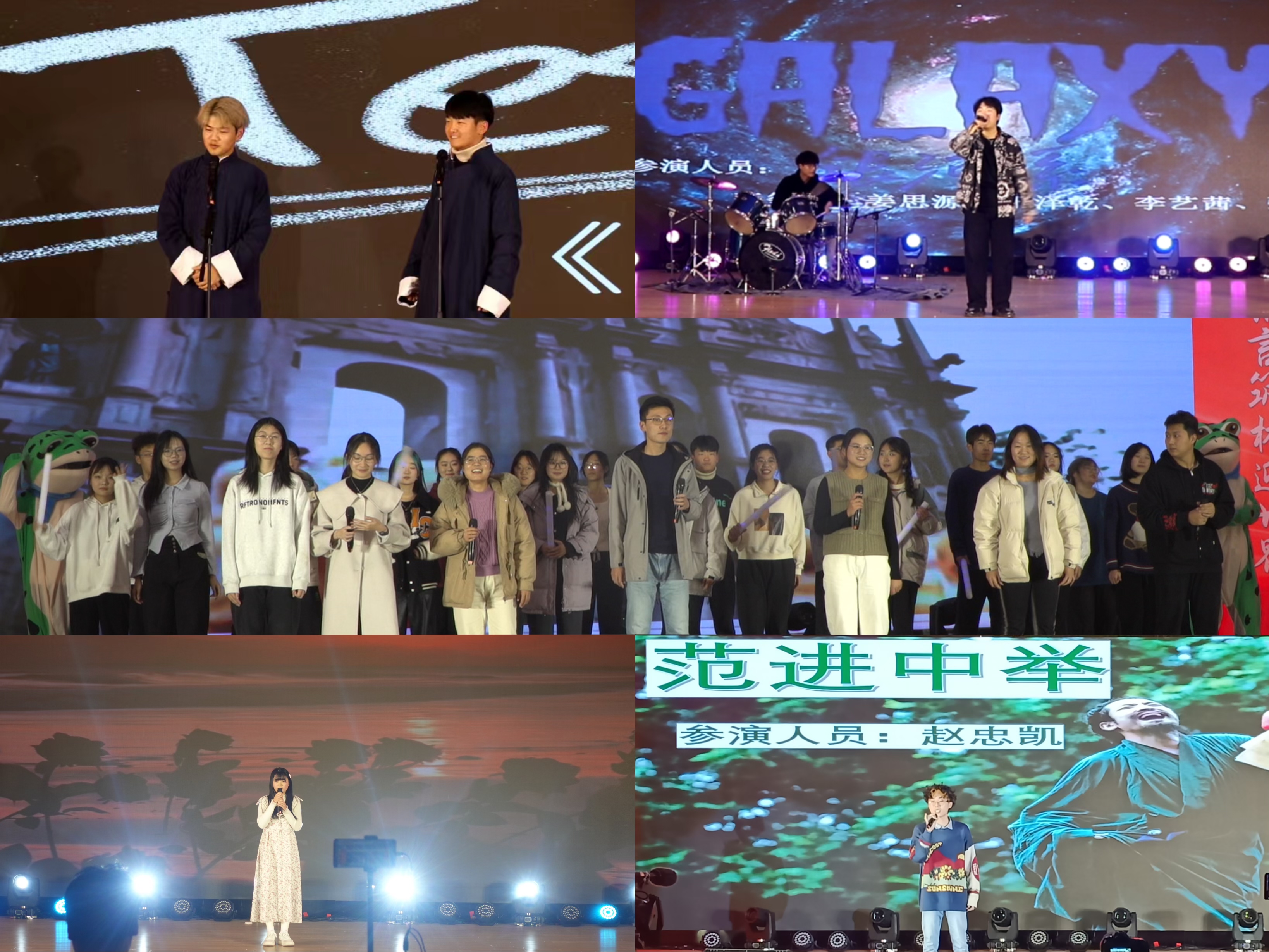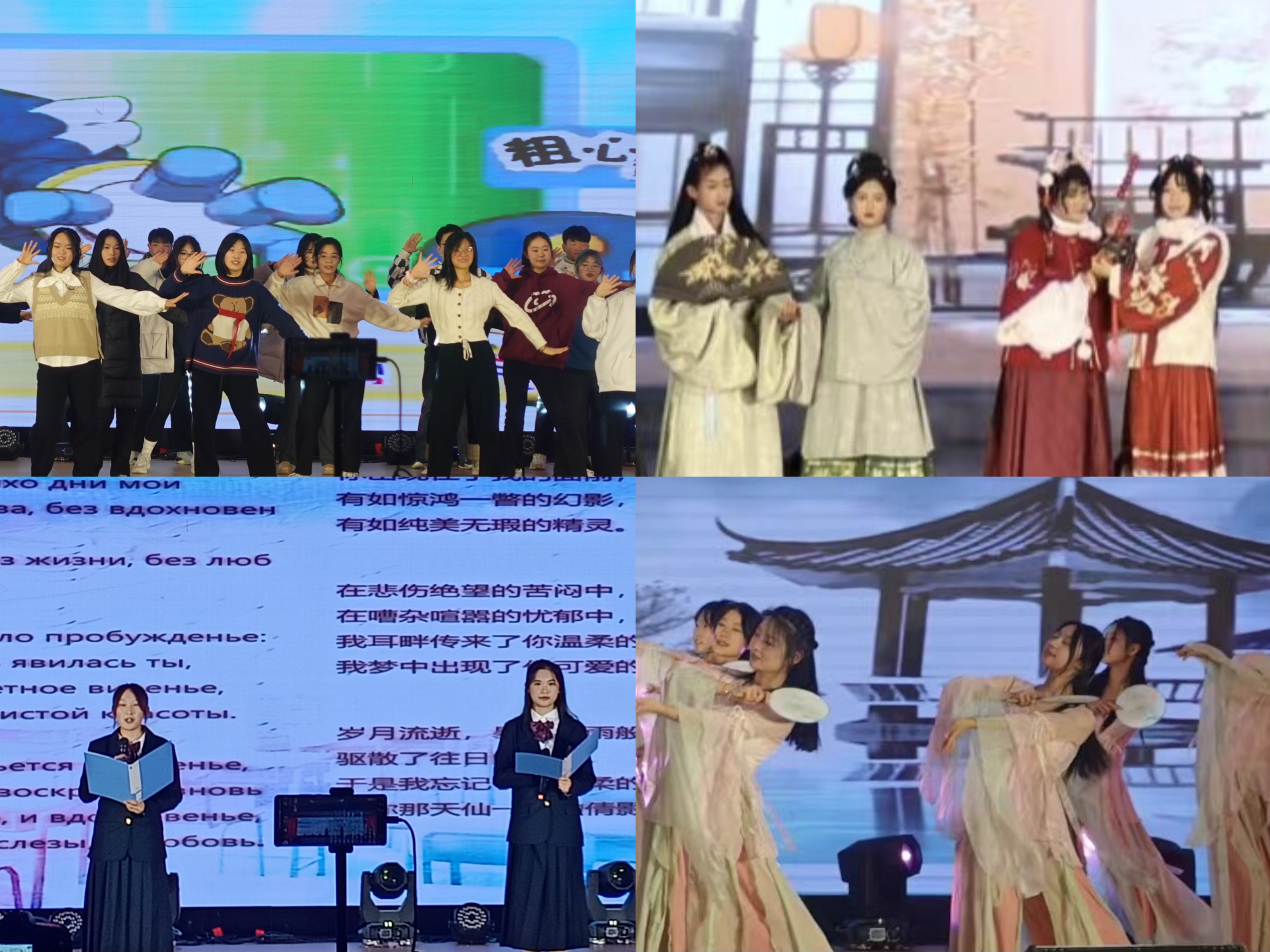 第二篇章,由外国语员工会骨干带来的舞蹈《开心向前飞》和《我乘着风飞过来》展现出fun88官网体育学子青春、活力的一面。大艺团带来的中国舞《入画江南》,摇曳的舞姿柔情如水,令人陶醉。相声节目《他是个卷王》,节目以诙谐的语调围绕“卷”字上演,呼吁着同学们摆脱内卷,良性竞争。《等你下课》的歌曲响起,我们的校园青春旋律也缓缓奏出。俄语朗诵《我记得那美秒的一瞬》,让人想起人生中那令人难忘的每个瞬间。歌曲《范进中举》,变化的曲调和饱含深意的歌词,句句都唱进了观众的心里。吉他爱好者协会带来的吉他演奏《奇迹再现》《我的未来式》《凄美地》彰显青春激情,把大家带入一个精彩纷呈的世界。汉服走秀《清平调》气势宏大,展示华服之美,将中国传统文化的博大精深体现的淋漓尽致。歌曲串烧《在爱的回归线》《不要忘记我爱你》《天外来物》《仰望星空》中,fun88官网体育学子用动人歌声,展现了属于fun88官网体育人的年轻活力与青春风采。晚会在公司团委老师以及员工会主席团带来的歌曲《相亲相爱》中划上完美的句号。