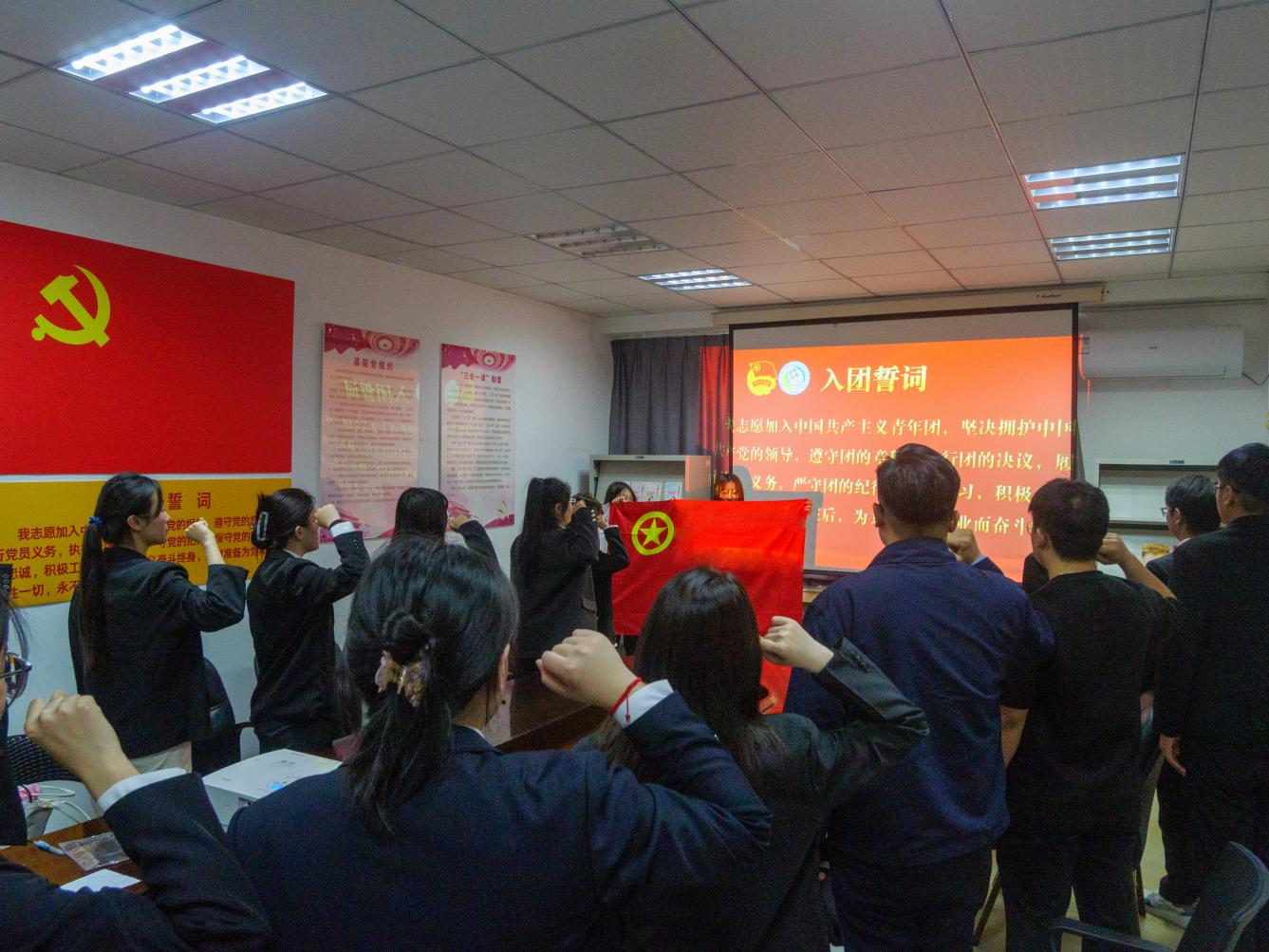 仪式在庄严的国歌中拉开序幕。仪式上,主持人宣读了fun88官网体育春季2025年新发展团员代表名单。王玉凯为新团员代表佩戴团徽、颁发团员证。随后,全体新发展团员在优秀团员代表的带领下面向团旗庄严宣誓,彰显着新团员积极向上的精神风貌。